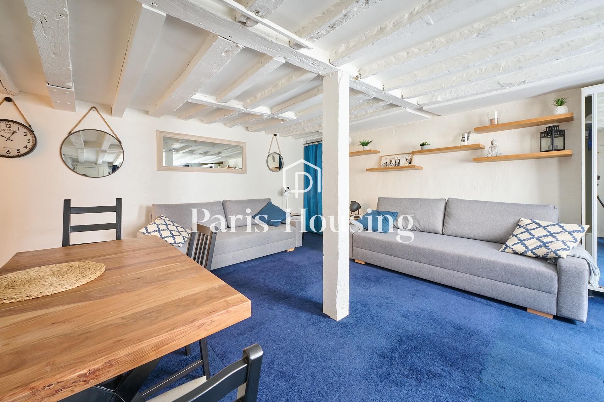 Appartement meublé de deux pièces situé rue du Bouloi dans le 1er arrondissement à proximité de la station Palais-Royal - Musée du Louvre (L1 et L7). Situé au 7ème étage sur cour (ascenseur jusqu'au 6ème) d'un bel immeuble ancien, il comprend : une entrée privative par le 6ème étage, séjour, cuisine séparée entièrement équipée, une chambre (en sous pente avec hauteur inférieur à 1,80m), une salle d'eau avec WC et rangements. Chauffage et eau chaude individuels (électrique).