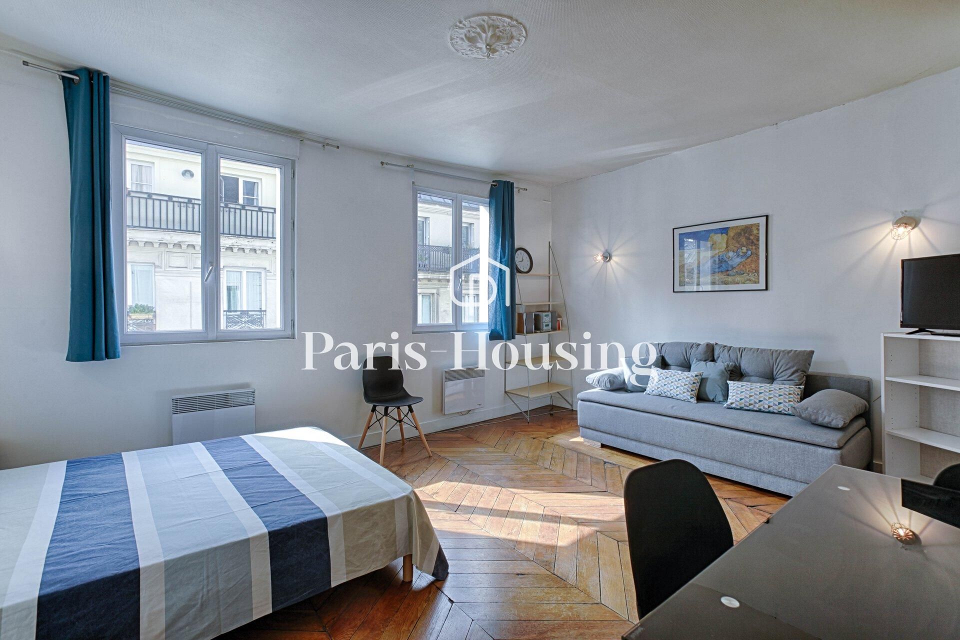 Large studio located on rue des Lombards in the 1st arrondissement next to Chatelet metro station (Lines 1, 4, 7, 11, 14, RER A, B, D). In a an old Parisian secured building, on the 4th floor (no lift), it is bright and with original wooden beams and floorboards. It is composed of : an entrance with walk-in closet, a large living room overlooking onto the street, an equipped semi-open kitchen, a shower room with toilets. Heating and hot water are individual (electric).